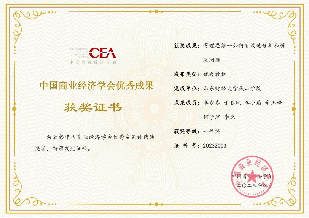 在剛剛結(jié)束的中國商業(yè)經(jīng)濟學會2023年度優(yōu)秀成果評獎活動中,由6776永利集團院長李永春教授主編的教材《管理思維---如何有效地分析和解決問題》榮獲優(yōu)秀教材一等獎。同時,在8月份進行的山東省第十五屆大學生科技節(jié)活動中,6776永利集團李永春、劉金煒指導的學生組榮獲山東省大學生智慧企業(yè)管理創(chuàng)新設(shè)計大賽數(shù)字商業(yè)企業(yè)模擬經(jīng)營對抗賽道一等獎。另外,在前不久公布的山東省教育科學研究院組織的2023年度山東省教育教學研究課題...